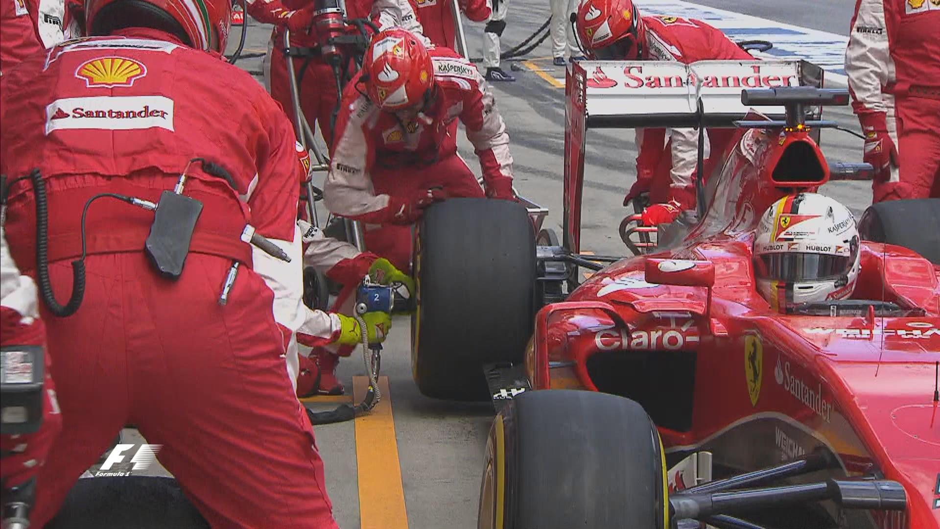 Sebastian Vettel, por su parte, tampoco se ha librado de los problemas cuandouna tuerca ha complicado la parada del piloto alemán haciéndole perder demasiado tiempo, por lo que se ha reincorporado a la carrera en cuarta posición, perdiendo el podio en favor de Felipe Massa, a quien no ha podido adelantar a pesar de ir cerrando la brecha con el paso de las vueltas.